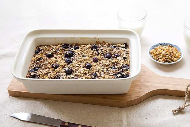 Baked oatmeal makes a healthy breakfast that can be made early in the week and reheated on a busy morning. This version features frozen blueberries for a sweet and hearty breakfast that's not loaded with sugar or saturated fat.
