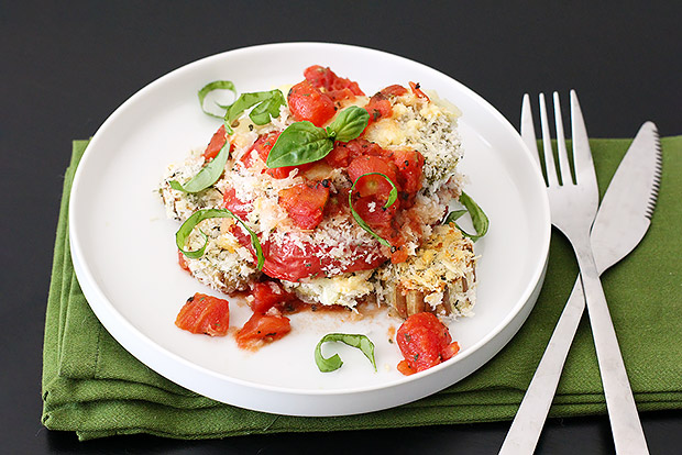 - Cut the tomatoes into ½-inch thick slices. Dip each slice in the egg whites and then into the bread crumbs to coat. Place the tomato slices on top of the eggplant and marinara.