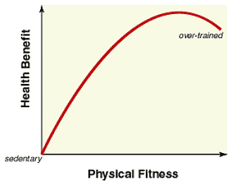 The correct amount of exercise depends on your current fitness level. If you are sedentary, you can improve your health by adding even small amounts of exercise. However, the health benefits are gained in a linear-type progression, up to a state of moderate fitness. Beyond this point, health gains slow and they can eventually drop off due to over-training (refer to Figure 1).