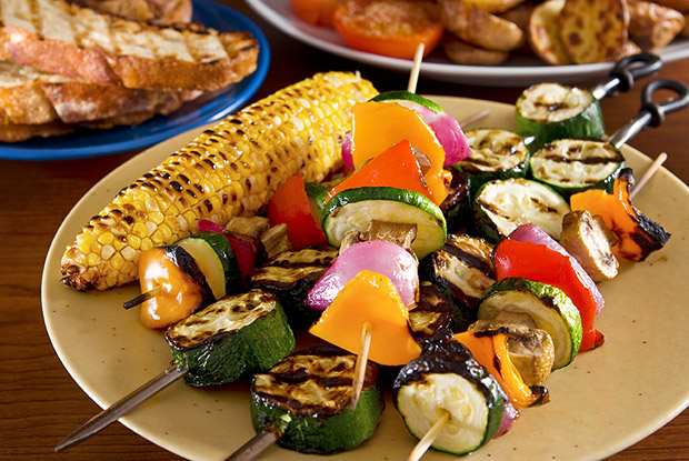 Grilling kabobs is a great way to incorporate vegetables to reduce total calories and saturated fat. Layer 2 to 3 1-oz pieces of meat with whole mushrooms, thick slices of bell peppers, wedges of onion, chunks of zucchini, chunks of fresh pineapple, or pieces of eggplant.
