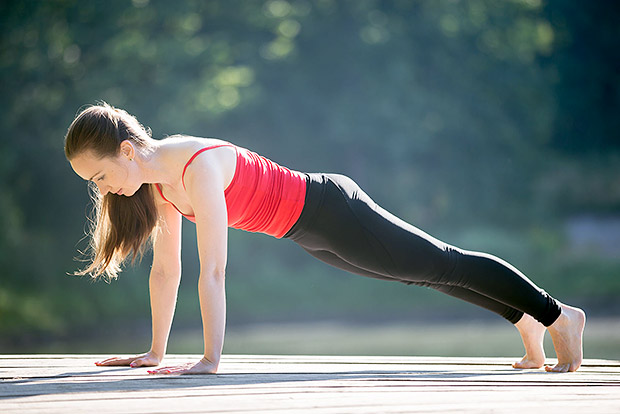 - Get into a plank position on your hands and toes. Your body should be straight from head to heels. Hold for 30 seconds.